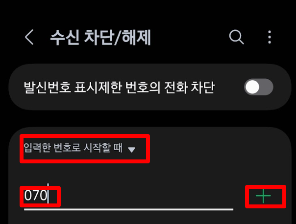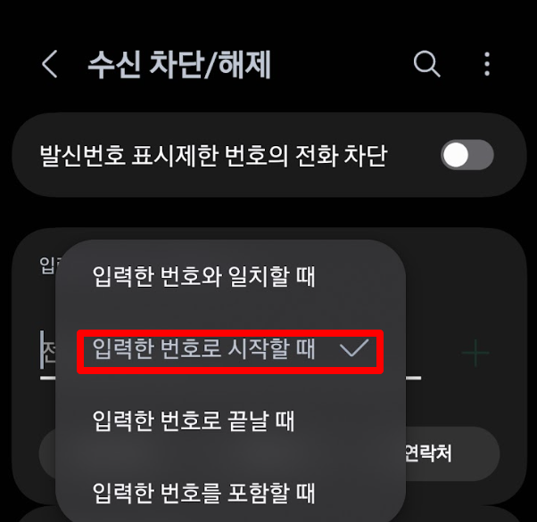 대부분 070을 입력하고 추가만 하시는데, 그렇게 되면 '070'이라는 딱 세 글자 번호만 차단이 됩니다. 하지만 스팸은 뒷번호가 계속 바뀌면서 오죠. 그래서 우리는 반드시 **'입력한 번호로 시작할 때'**라는 옵션을 선택해야 합니다. 이 설정이 풀려있거나 잘못되어 있으면 차단 기능이 무용지물이 됩니다.