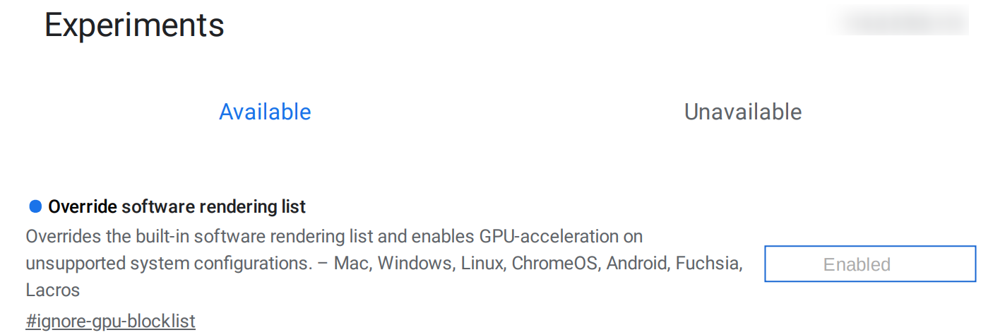 4. 추가로 **Override software rendering list**를 검색하여 **Enabled**로 바꿉니다. (이 설정은 오래된 그래픽 칩셋에서도 강제로 가속을 쓰게 해 줍니다.)