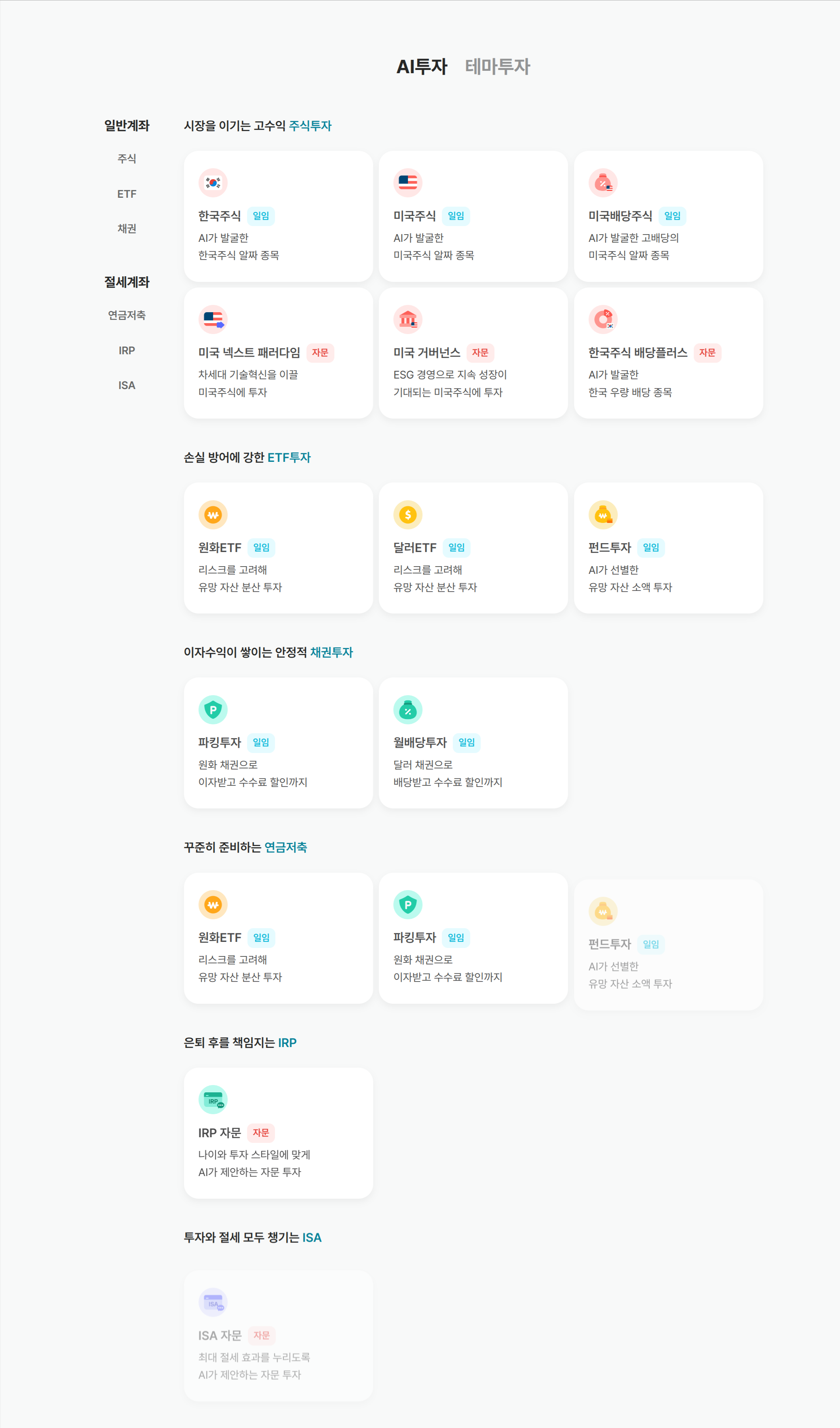 - AI투자: 일반계좌와 절세계좌로 나누어, 시장을 이기는 고수익 투자 / 손실방어에 강한 ETF투자를 할 수 있습니다. 본인의 성향에 따라 안정형/중립형/적극투자형을 선택할 수 있습니다.