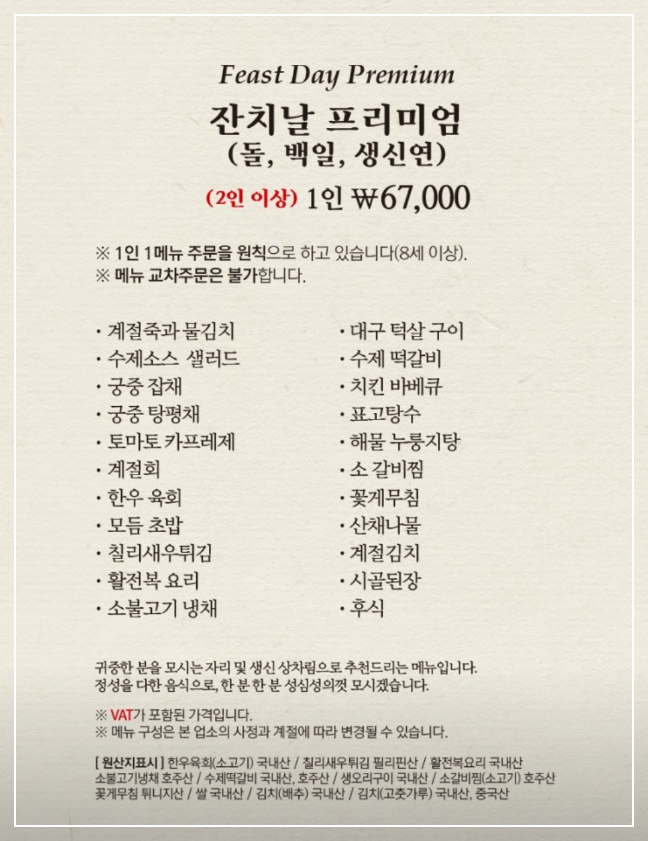 3. "잔칫날 프리미엄" 코스 구성 (1인 67,000원)