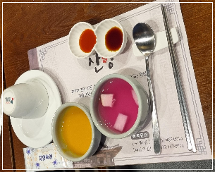 - 호박죽 & 물김치 : 호박죽은 2~3스푼 정도의 적당한 양으로 달콤하게 입맛을 돋워주었고, 비트가 들어간 물김치는 색감이 참 예쁘고 새콤달콤했어요.