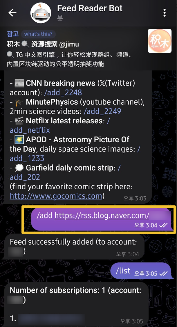 텔레그램에서 @TheFeedReaderBot 검색 후 [시작] 버튼 클릭