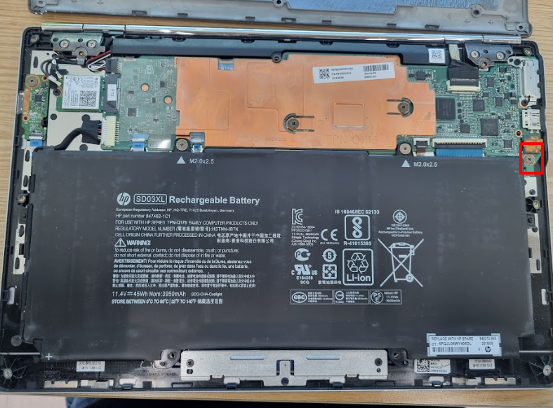 이 위치는 일반적인 크롬북 분해 가이드에는 잘 안 나와 있어서 많이 헤맸습니다. 같은 모델이라면 참고하세요.