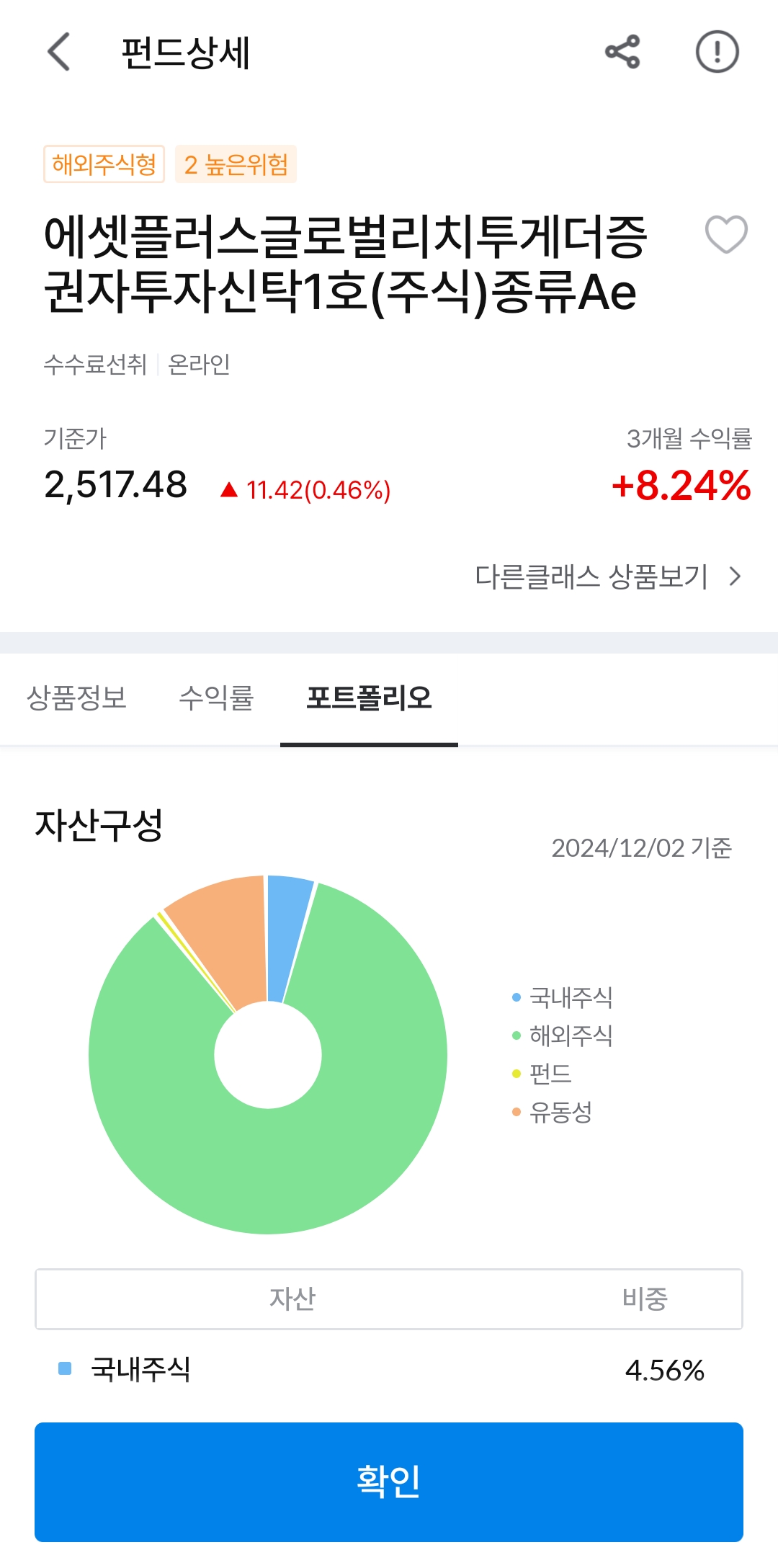 포트폴리오를 보면, 국내주식이 4.56%, 해외주식이 84.8%, 펀드 0.73%, 유동성 9.9%