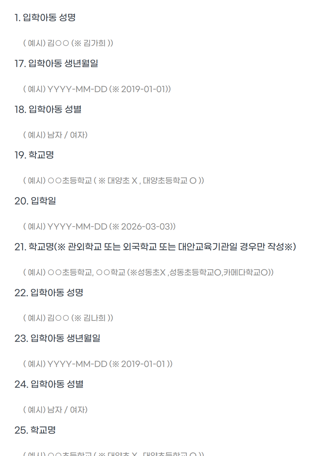 그리고 아이 출생연도가 아니라 '2026년 초등학교 입학 여부'가 기준이에요. 입학유예 후 올해 입학하거나 조기 입학한 경우도 입학이 확인되면 신청 가능합니다.